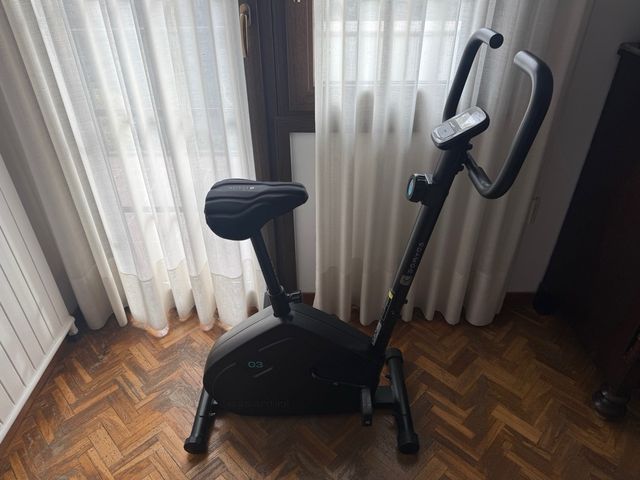 Bicicleta estática de color negro, ideal para entrenamientos en casa. - Diseño compacto. - Asiento acolchado. - Manillar ergonómico.