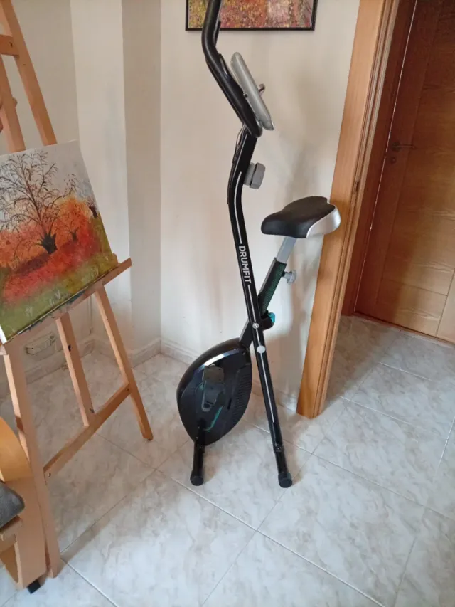 Bicicleta estática de la marca Drumfit, ideal para entrenamientos en casa. - Diseño compacto y funcional. - Asiento acolchado para mayor comodidad. - Manillar ajustable.