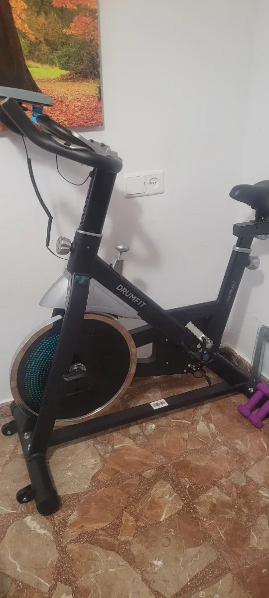 Bicicleta estática de la marca Drumfit, ideal para entrenamientos en casa. Su diseño es robusto y moderno. - Color negro. - Volante de inercia. - Manillar ajustable.