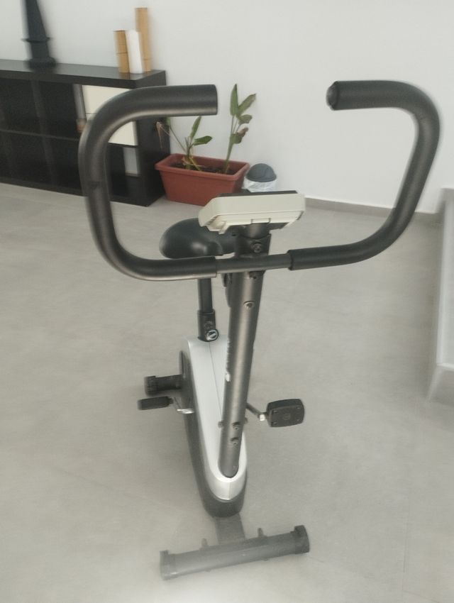 Bicicleta estática para hacer ejercicio en casa. Su diseño es compacto y funcional. - Manillar ergonómico. - Pedales con agarre. - Pantalla digital.