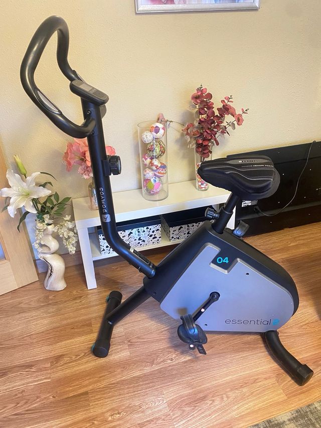 Bicicleta estática Essential 04 en buen estado. Ideal para entrenamientos en casa. - Diseño moderno en gris y negro. - Sillín ajustable.