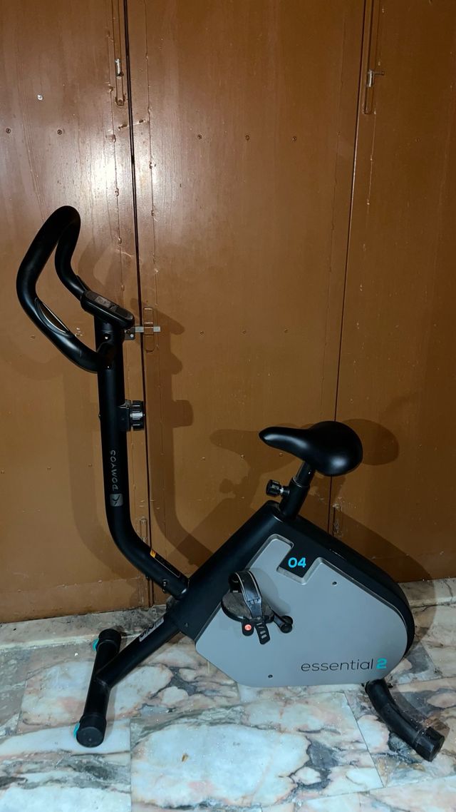 Bicicleta estática marca DOMYOS, modelo Essential 2. - Diseño en color negro y gris. - Pantalla digital. - Pedales con sujeción. - Ajuste de resistencia.