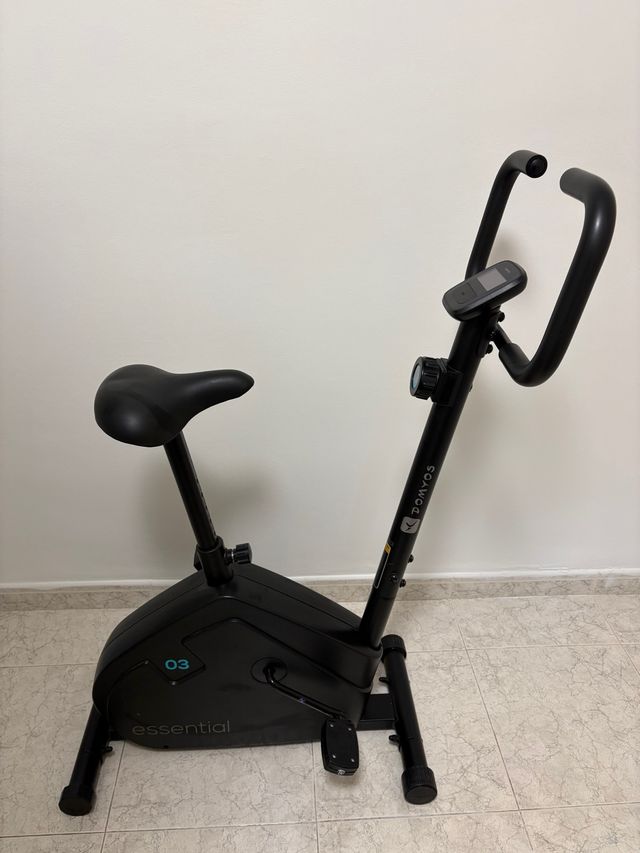 Bicicleta estática de color negro, modelo Essential O3. - Diseño compacto y moderno. - Manillar ergonómico. - Pantalla digital integrada.
