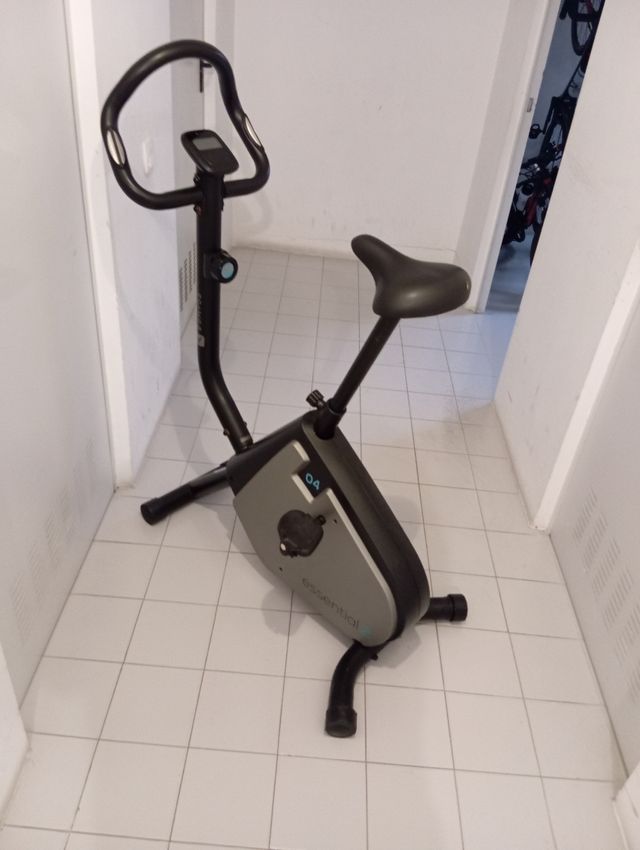 Bicicleta estática de la marca Essential, modelo Q4. Diseñada para entrenamientos en casa. - Manillar ergonómico. - Sillín ajustable. - Pantalla digital.