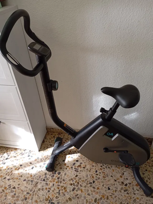 Bicicleta estática de color negro y gris, con pantalla digital. - Manillar ergonómico. - Sillín ajustable. - Pantalla con información de entrenamiento.