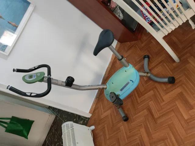 Detalles del productoBicicleta estática de color azul y gris, ideal para entrenamientos en casa. Cuenta con un monitor digital para seguir tu progreso.