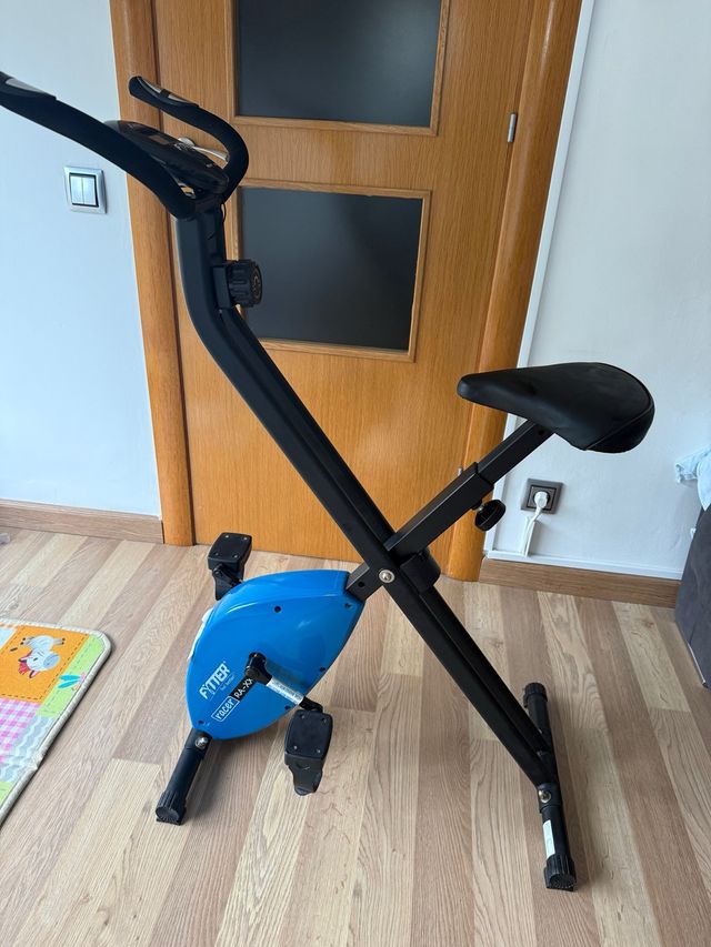Bicicleta estática plegable de color azul. - Diseño compacto y fácil de almacenar. - Asiento acolchado para mayor comodidad. - Pedales con correas ajustables.