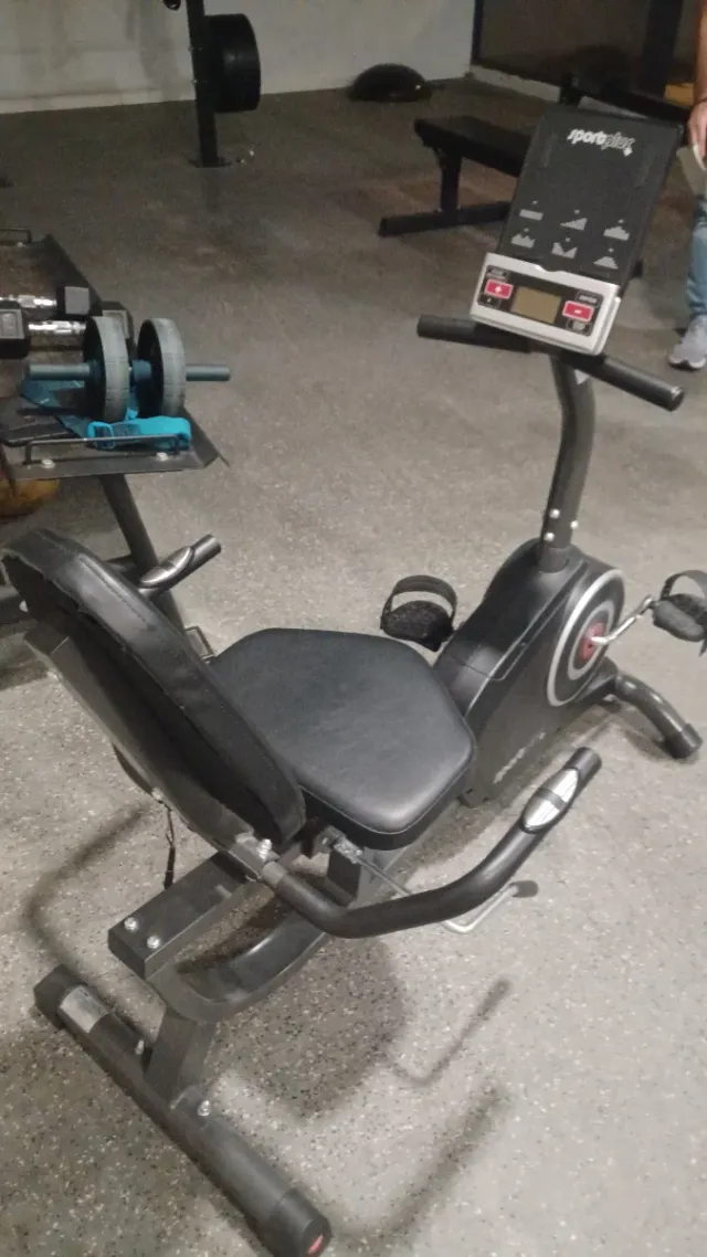 Bicicleta estática de gimnasio en color negro. Diseñada para entrenamientos en casa. - Asiento acolchado. - Pedales con sujeción. - Pantalla digital.