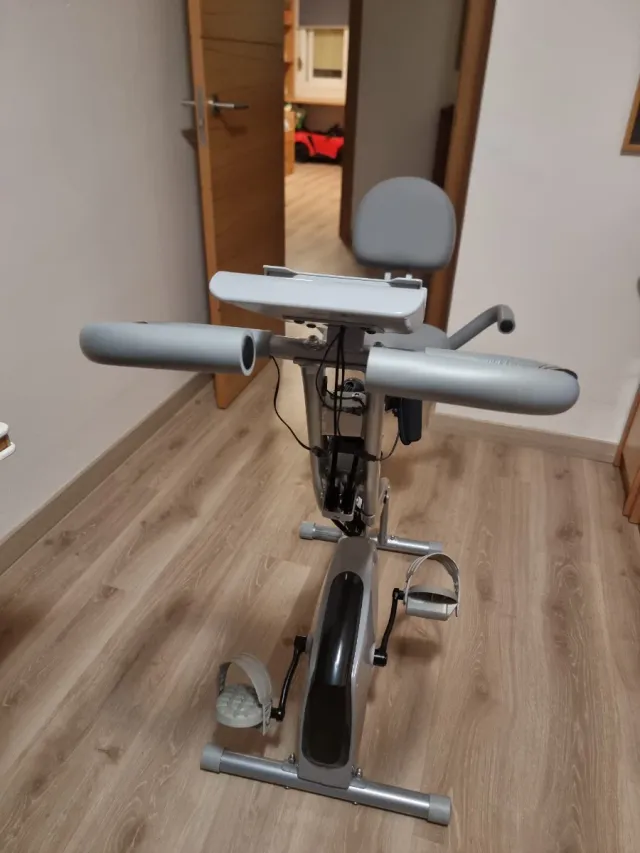 Detalles del productoBicicleta estática de color gris, ideal para hacer ejercicio en casa. Cuenta con un diseño compacto y funcional.