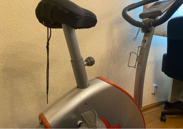 Detalles del productoBicicleta estática con un diseño moderno en gris y detalles naranjas.