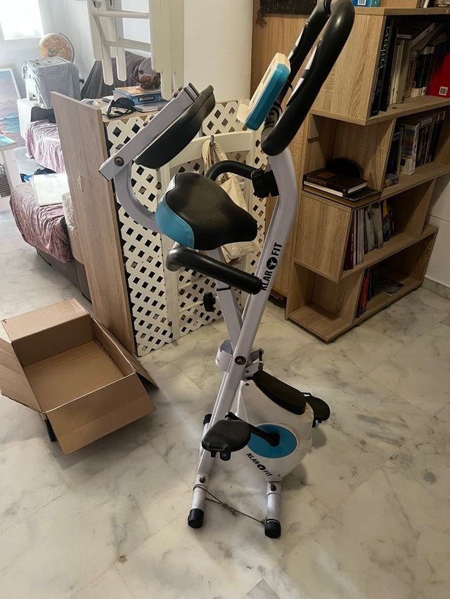 Detalles del productoBicicleta estática de color blanco y azul. Gira bien pero no regula la dureza, para el que la sepa arreglar.
