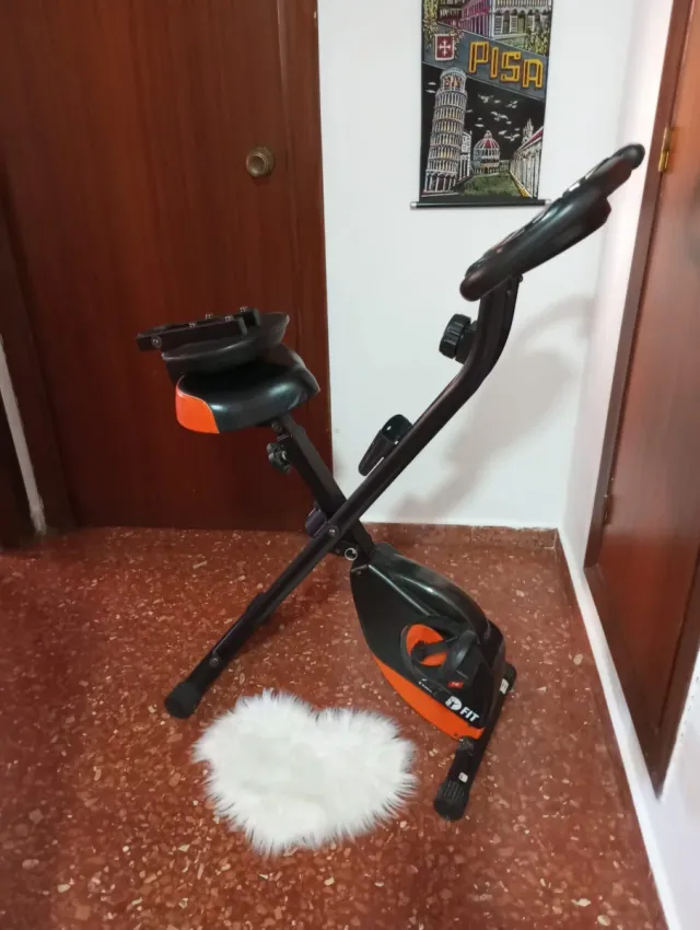 Bicicleta estática de color negro y naranja. - Diseño plegable para fácil almacenamiento. - Asiento acolchado. - Pedales con agarre.