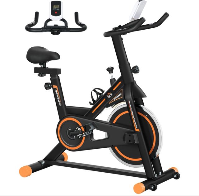 Detalles del productoBicicleta estática de diseño moderno en color negro con detalles en naranja. Ideal para entrenamientos en casa.