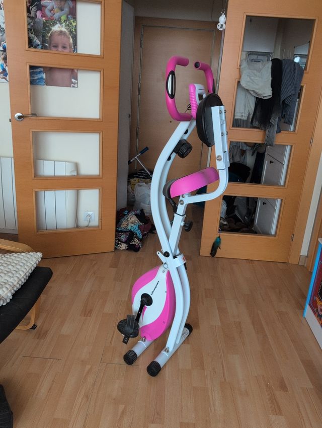 Detalles del productoBicicleta estática plegable, ideal para hacer ejercicio en casa. Es de color rosa y blanco, y se encuentra en muy