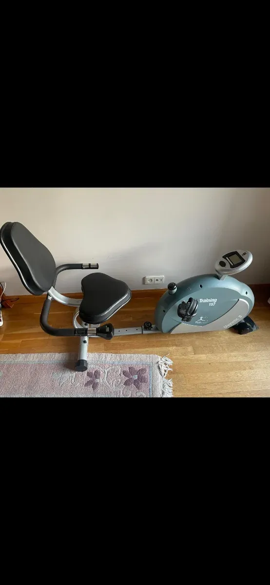 Detalles del productoBicicleta estática reclinada de color gris y negro. Ideal para entrenamientos en casa.