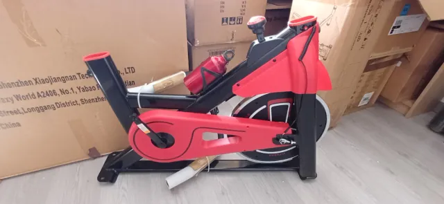 Detalles del productoBicicleta estática de color rojo, ideal para entrenamientos en casa. Diseñada para ofrecer una experiencia de ciclismo cómoda y efectiva.