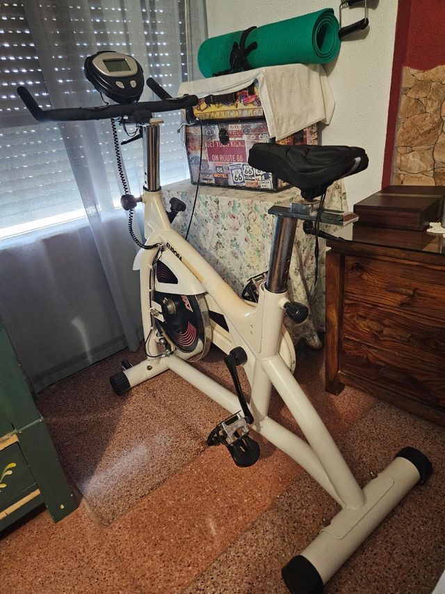 Detalles del productoBicicleta estática de spinning en color blanco. Perfecta para entrenamientos en casa.