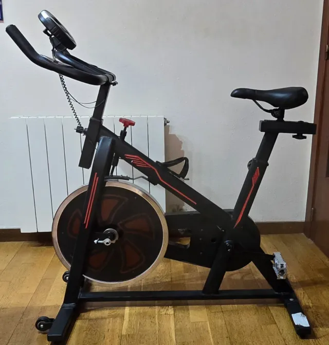 Detalles del productoBicicleta estática para entrenamientos en casa. Diseño moderno en color negro con detalles rojos.