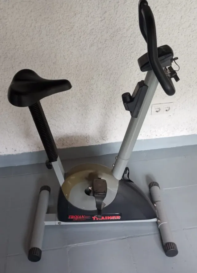 Detalles del productoBicicleta estática Trojan Trainer en color gris y negro. Ideal para entrenamientos en casa.