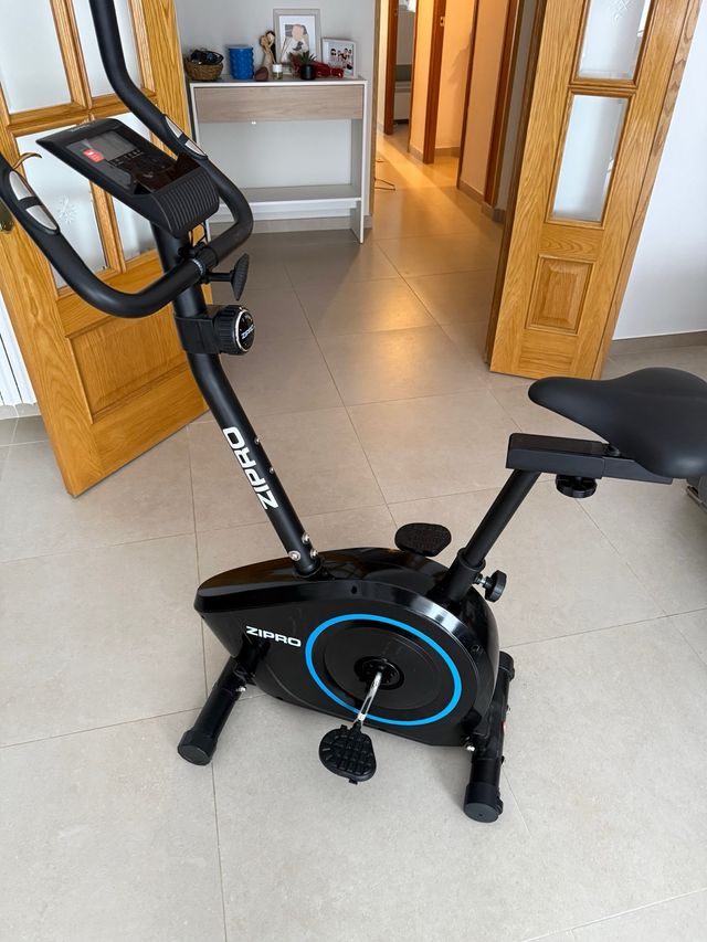Bicicleta estática de la marca Zipro en color negro. Diseñada para el ejercicio en casa. - Estructura robusta. - Asiento ajustable. - Pedales con agarre.