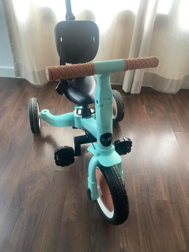 Bicicleta evolutiva 5 en 1 Olmitos en color menta y detalles en marrón. - Asiento acolchado. - Manillar con puños texturizados.