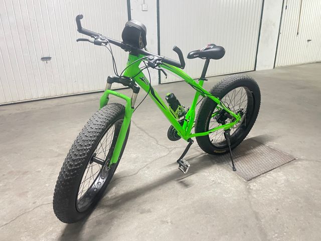 Detalles del productoBicicleta Fat Bike de color verde, con un diseño llamativo y ruedas anchas para todo tipo de terrenos. Ha sido utilizada una sola vez, por lo que se encuentra en un estado excelente.