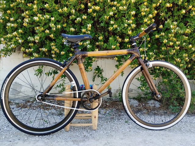 bicicleta artesanal de bambu, uniones de cañamo y resina epoxy con terminación de porcelanato. freno contrapedal. esta recien terminada, nueva sin uso. talla s/m