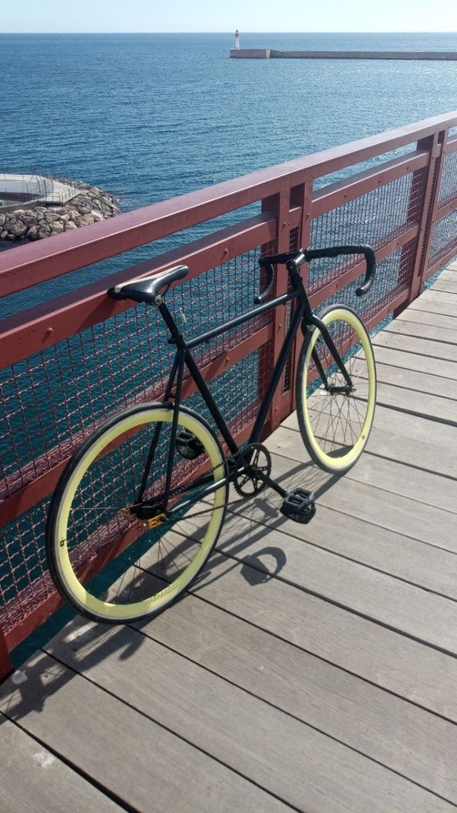 Detalles del productoBicicleta fixie en color negro con detalles llamativos en los perfiles de las ruedas.