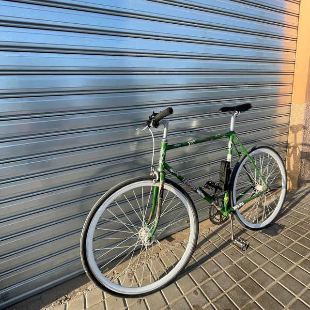 Bicicleta fixie de color verde, ideal para desplazamientos urbanos. Es un modelo muy fiable. - Cuadro de bicicleta. - Ruedas blancas. - Manillar negro.