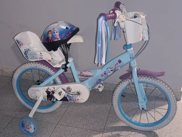 Detalles del productoBicicleta infantil de 16 pulgadas con temática de Frozen. Incluye casco a juego y ruedines para facilitar el aprendizaje.