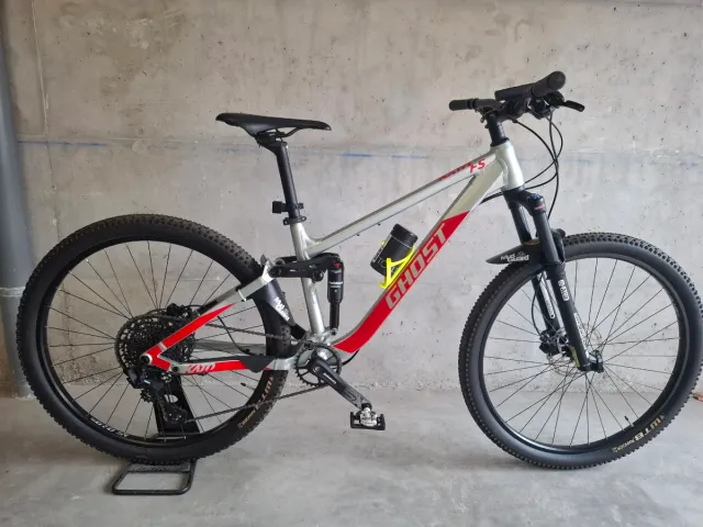 Detalles del productoBicicleta de montaña Ghost FS con suspensión delantera y trasera.