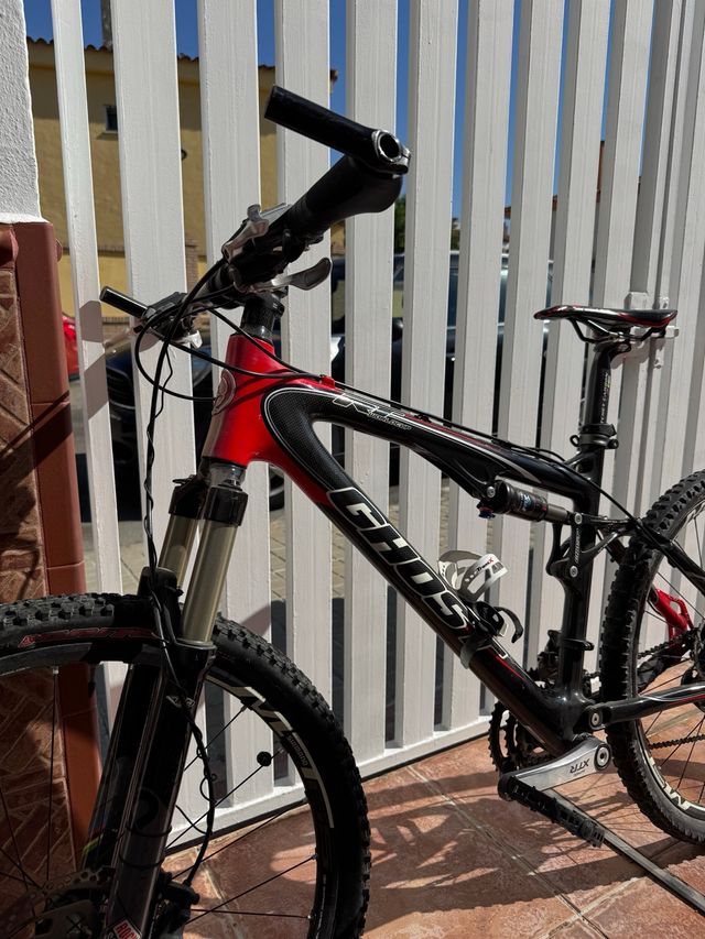 Detalles del productoBicicleta de montaña Ghost con suspensión delantera y trasera. Cuadro de carbono y aluminio en color rojo y negro.