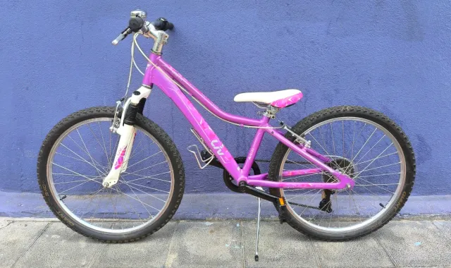 Bicicleta Giant para niña en color morado, con un solo plato. - Cuadro de aluminio. - Ruedas de 20 pulgadas. - Frenos V-Brake. - Suspensión delantera.