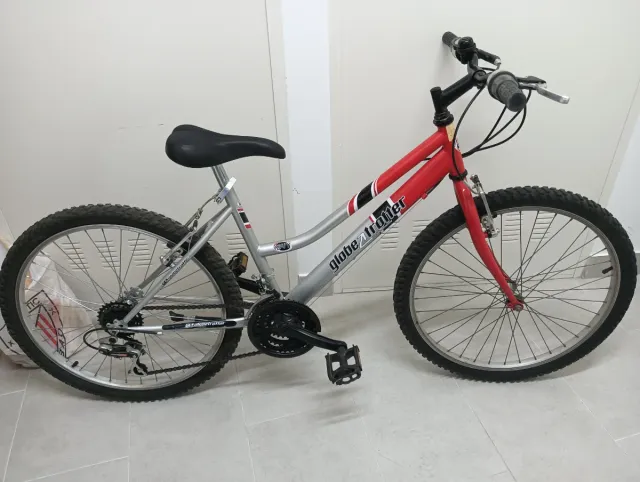 Detalles del productoBicicleta de montaña Globe Trotter con un diseño llamativo en rojo y plata.