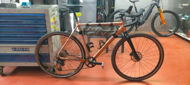 Detalles del productoBicicleta de gravel color cobre, detalles en negro y protectores All Mountain Style.