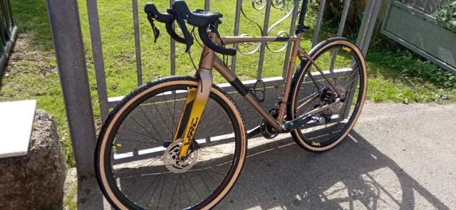 Detalles del productoBicicleta de gravel Conor Kalima en color bronce y amarillo.