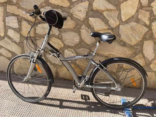 Bicicleta de paseo en color gris. - Cuadro de aluminio. - Ruedas de 26 pulgadas. - Guardabarros delantero y trasero. - Sillín ajustable. - Bolsa delantera negra.