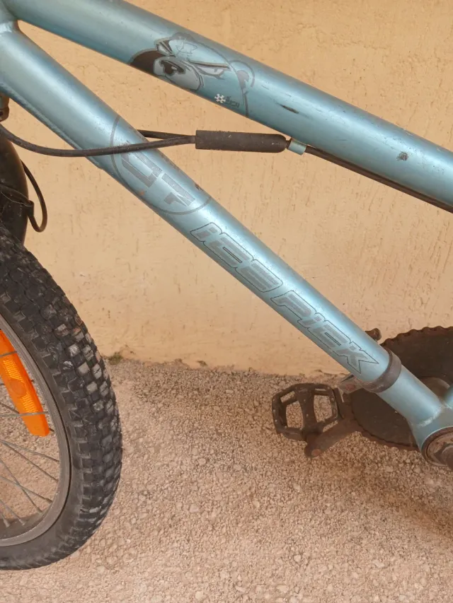 Bicicleta de color azul claro con detalles gráficos. - Cuadro de bicicleta. - Rueda delantera. - Pedales.