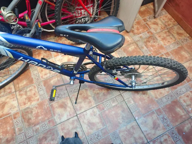 Bicicleta de montaña Hador en color azul. - Cuadro de metal. - Rueda trasera con banda de rodadura marcada. - Sillín negro con detalles rojos.
