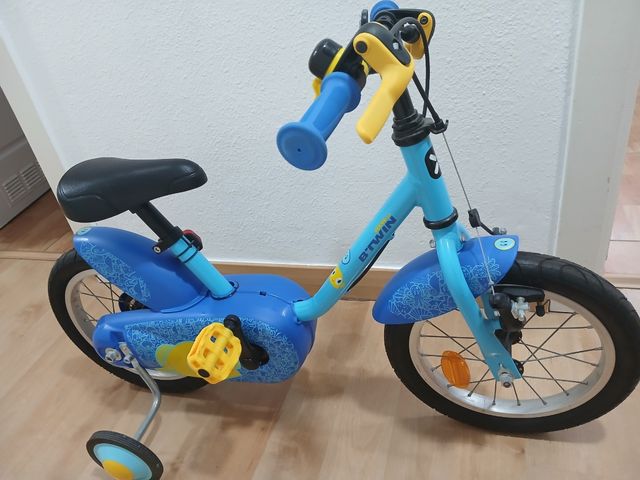 Bicicleta infantil Btwin de 14 pulgadas en color azul. - Ruedines incluidos. - Pedales amarillos. - Diseño con dibujos. - Manillar azul y amarillo.