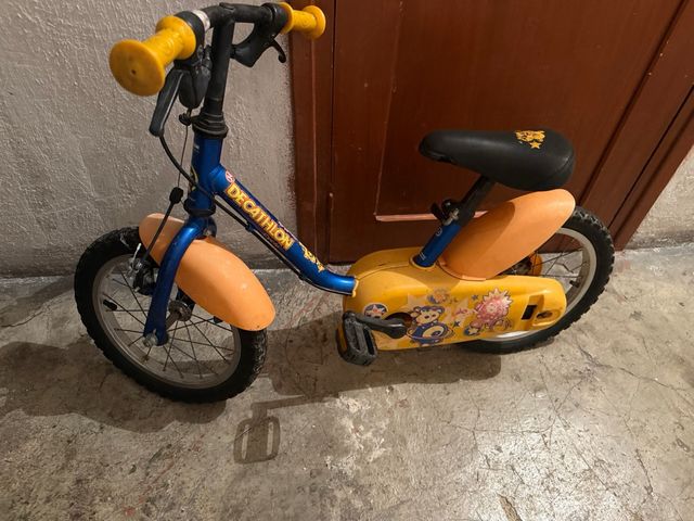 Detalles del productoBicicleta infantil Decathlon de 14 pulgadas, ideal para niños de 3 a 5 años. Cuenta con un diseño divertido y colorido.