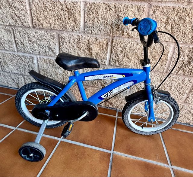 Bicicleta infantil de 14 pulgadas, ideal para los más pequeños. - Color azul vibrante. - Ruedines de apoyo incluidos. - Diseño deportivo con detalles gráficos.