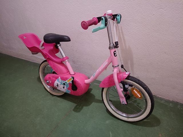 Detalles del productoBicicleta infantil de 14 pulgadas de color rosa con un divertido diseño de unicornio. Contiene asiento para muñecas, y ruedines para comenzar la etapa de iniciación