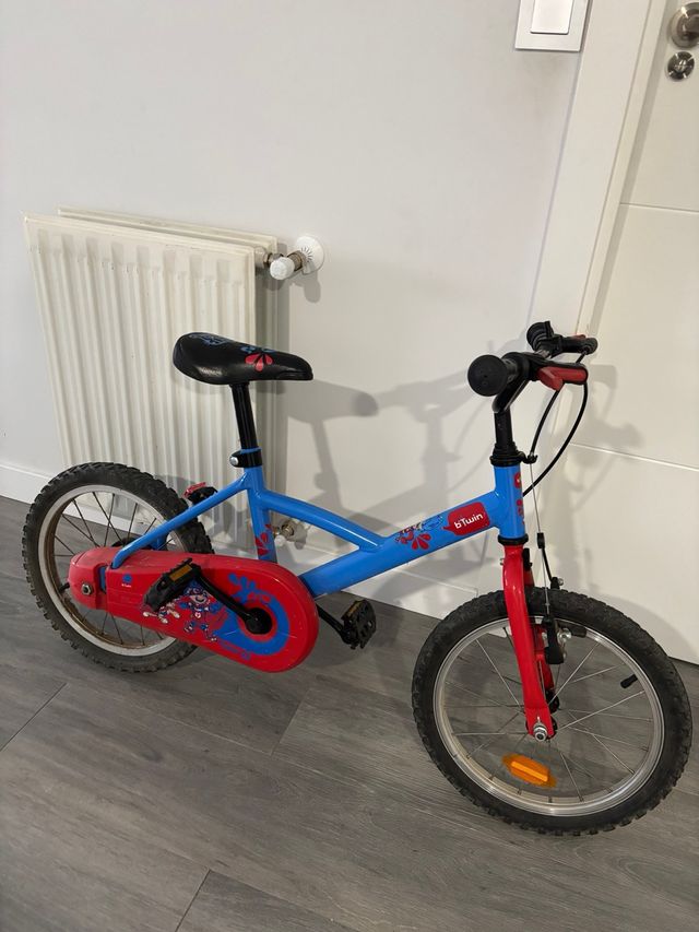 Detalles del productoBicicleta infantil de 16 pulgadas en color azul, con detalles en rojo y dibujos.