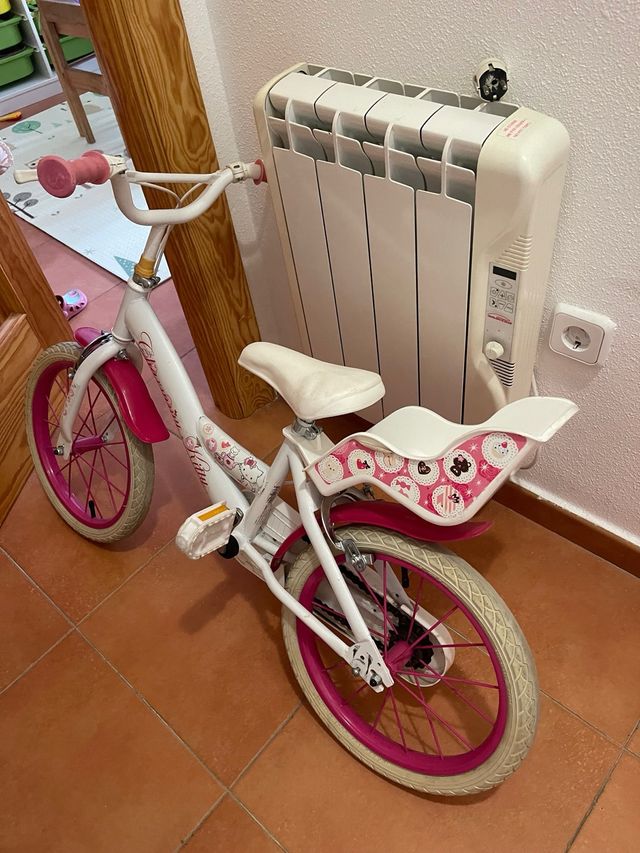 Bicicleta infantil de 16 pulgadas con diseño de Hello Kitty. - Color blanco y rosa. - Sillín blanco.