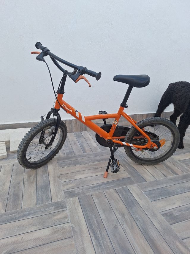 Detalles del productoBicicleta infantil de 16 pulgadas en color naranja.Usada con algunos signos de desgaste pero en las fotos se ve el estado de las ruedas y sillín nuevo. Nada roto, algún roce que se ve en las fotos pero manillar de goma nuevo, un poco desgastado el filo de los frenos, todo en las fotos.