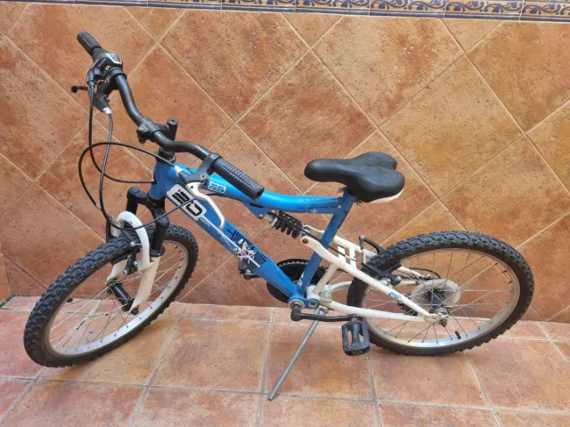 Bicicleta infantil de 20 pulgadas con doble suspensión, ideal para aventuras. - Cuadro azul y blanco. - Ruedas todoterreno. - Sillín negro. - Pedales negros.