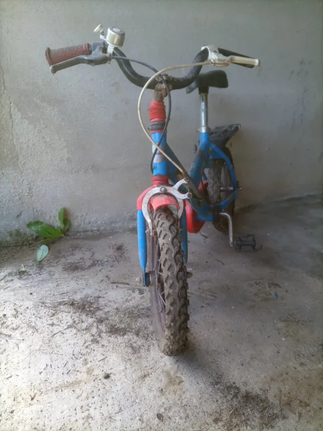 Bicicleta pequeña de color azul y rojo, ideal para los más pequeños. - Manillar con puños. - Timbre. - Rueda delantera con banda de rodadura. - Frenos.