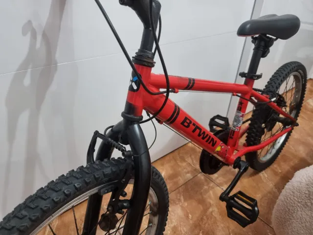 Bicicleta infantil B'TWIN en color rojo, ideal para niños y niñas. Se encuentra en muy buen estado. - Frenos en buen estado. - Ruedas con buen agarre.