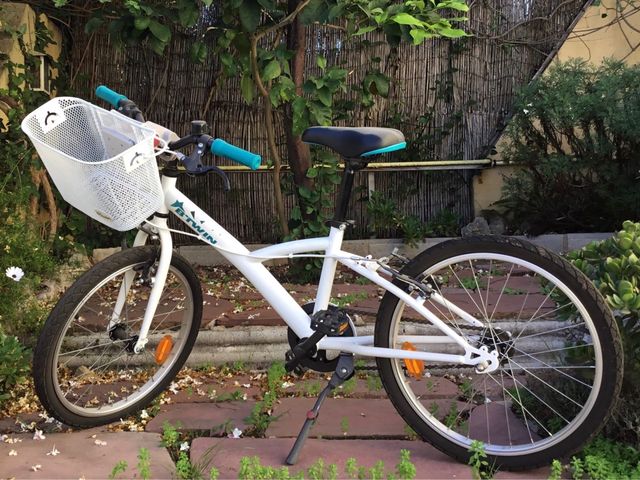 Bicicleta infantil de color blanco y puños de color azul. Modelo BTWIN Original 100 de 20 pulgadas, ideal para niños de 6 a 9 años. Incluye cesta delantera.